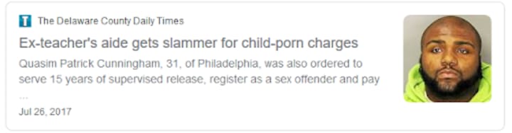 “A former Philadelphia teacher’s aide who sent pornographic images to a 13-year-old boy has been sentenced to 20 years in federal prison for the attempted manufacture of child pornography and related charges. Quasim Patrick Cunningham, 31, of Philadelphia, was also ordered to serve 15 years of supervised release, register as a sex offender and pay $1,100 in special assessments, according to a judgment handed down by U.S. District Judge Paul Diamond of the Eastern District of Pennsylvania.”