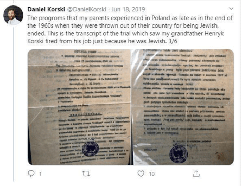 Daniel Korski himself would eventually head to Twitter to show people the evidence that his parents were Jewish refugees fleeing persecution. He would post two images of official court documents sealed in plastic sleeves and describe it as evidence of a pogrom. For those who are unaware, a pogrom is described as “an organized massacre, especially of Jews”. But do the documents supplied by Daniel Korski provide any evidence of a massacre of Jewish people? The straight answer is a definite no. The court papers Korski so proudly presents on Twitter do not mention Judaism at all, but they do mention Henryk Korski’s stance on the war between Israel and Egypt. The documents, which were written in Polish, relate to a court case involving Henryk Korski and his employer.